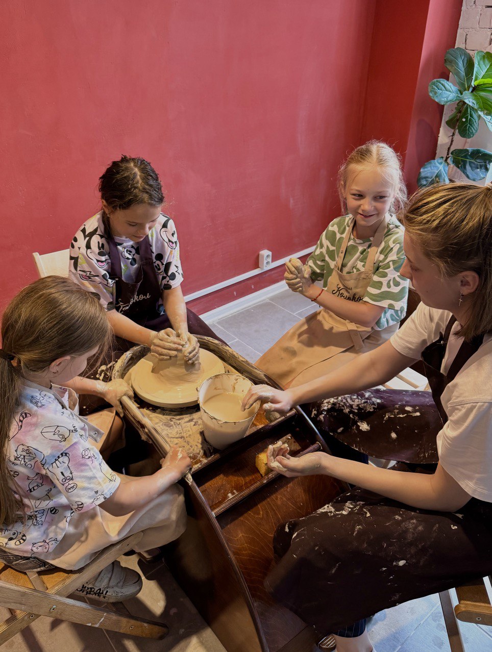 На этом мастер-классе дети работают и за гончарным кругом и лепят руками. За кругом мы делаем основу подсвечника - корпус домика. А за столом раскатываем большой пласт для будущей крыши, рисуем черепицу или делаем узор кружевом/фигурной скалкой. После этого крышу и корпус нужно соединить специальным способом. Начинаем украшать! Тут у каждого гончаренка есть возможность проявить фантазию. Ребята вырезают фигурные окошки и рисуют дверцы, используют вырубные формочки для печенья или орудуют маленьким стеком. Кто-то приклеивает звездочки и сердечки, кто-то рисует цветы.